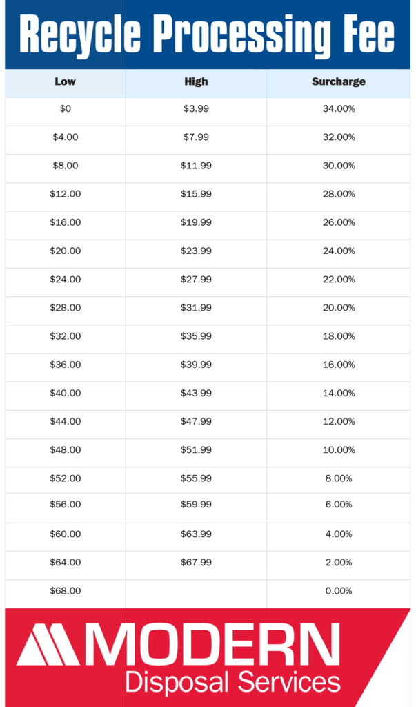 Moderns Recycling Processing Fee helps support the collection, sorting, and handling of recyclable materials so they can be responsibly reused. This fee is necessary to balance changing market values of recyclables, and the impact of non-recyclable items in the recycling stream. By using this approach, we ensure that recycling programs remain reliable and sustainable for our customers and communities, providing the lowest possible base rate on recycling services. The fee is calculated using the table below that adjusts based on current recycling market conditions and processed material compositions.